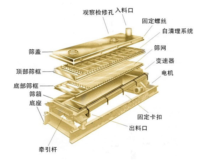 方形搖擺篩由進料口、防塵蓋、出料口、彈簧、束環(huán)、基座、振動電機等組成。