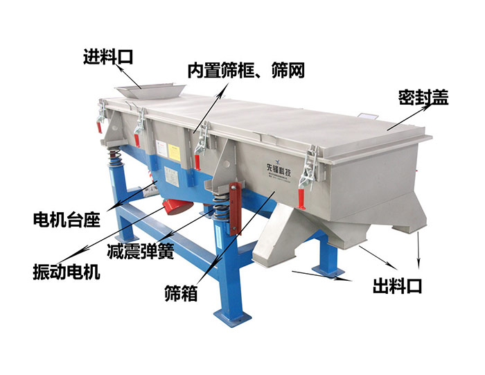 不銹鋼直線振動篩主要由篩箱、篩框、篩網、振動電機、電機臺座、減振彈簧、支架等組成。